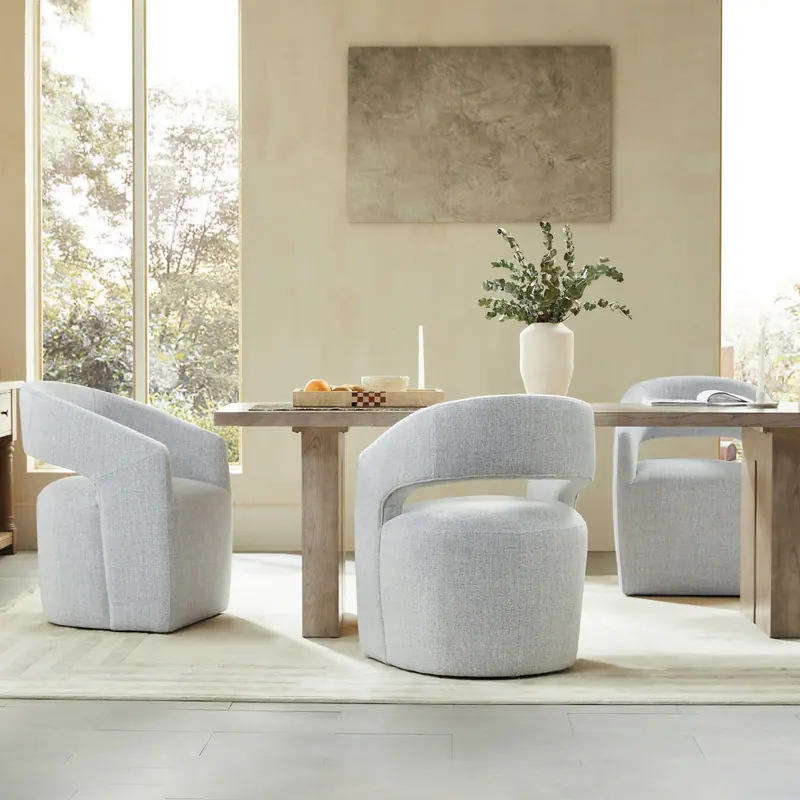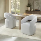 Elevate your dining experience with our Contemporary Dining Chair with Casters, a perfect blend of modern style and comfort. Designed to seamlessly complement modern interiors, this barrel dining chair boasts a sleek silhouette and clean lines. The addition of Caster wheels not only enhances its contemporary appeal but also provides flexibility in arranging it around your dining table. Indulge in comfort during your meals, as the upholstered rolling dining chair features a soft upholstered seat and a curved barrel-style back that offers ample support. The light-colored finish of the upholstery adds a touch of warmth and charm to your dining space. Crafted from solid wood and engineered wood, the frame ensures enduring durability. Â Add a touch of fun and style to your decor with our dining chair armchair. Ideal for any space,this also works great as reading chair in offices,bedrooms,or living rooms.